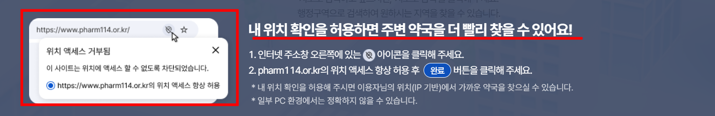 위치 액세스 허용을 선택하면, 현재 사용자의 위치를 자동으로 인식하여 주변의 가장 가까운 휴일지킴이 약국을 빠르게 찾아줍니다. 이 기능은 특히 외출 중이거나 낯선 지역에서 유용하게 사용할 수 있습니다.